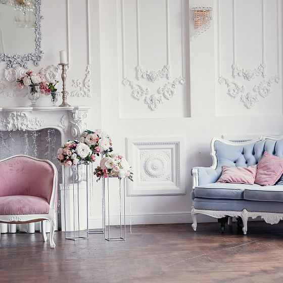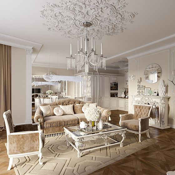 Дизайном интерьера, конечно, занимается женщина. Она в курсе последних трендов и рекомендаций известных дизайнеров, а еще интуитивно опирается на собственное чувство стиля и видение красоты. Все сделано лучшими мастерами только из ценных материалов и чаще всего по индивидуальному заказу. Гостиную обязательно украшает дорогая люстра из последней коллекции и изящная мягкая мебель. Сделать комнаты более радушными и естественными помогают живые цветы в вазах и изысканный декор: классические картины, семейные фото в рамках, фарфоровая посуда, текстиль с изящными узорами. Планировка должна быть открытая, а потолки высокими, чтобы помещения наполнялись светом и воздухом. На полу — паркет, который органично сочетается с плинтусом и дверными проемами. Двери в классическом стиле, но с модным,  утонченным и изысканным дизайном. Конечно, в эмали. Цвет - белый, молочный или другие пастельные тона.