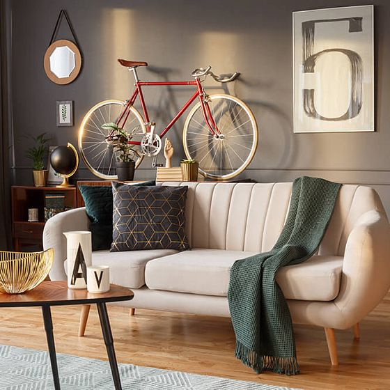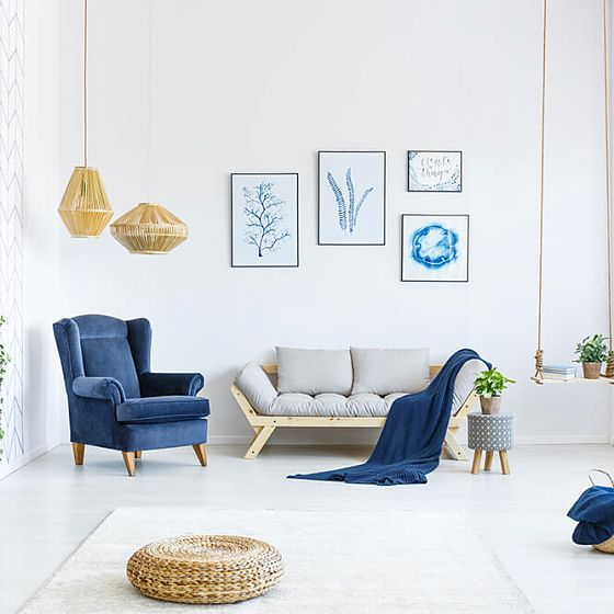 Для стен можно выбрать фактурную штукатурку, матовые бумажные обои или краску. На полу удачно будет смотреться плитка, паркет или ламинат. Потолок чаще всего выполняется в белом цвете. Его можно покрасить или сделать натяжным. Оригинально будет смотреться на потолке украшение из темных деревянных балок. Отличным дополнением для обстановки станут различный атмосферный декор, например столешница из дикого камня, ваза из необработанной керамики, зона с кирпичной кладкой, брутальная циновка. С ними интерьер приобретет не только самобытность, но и нотку дерзости, с которой станет еще интереснее. Помимо этого актуальными украшениями также станут изделия из джута, дерева, кожи или глины.